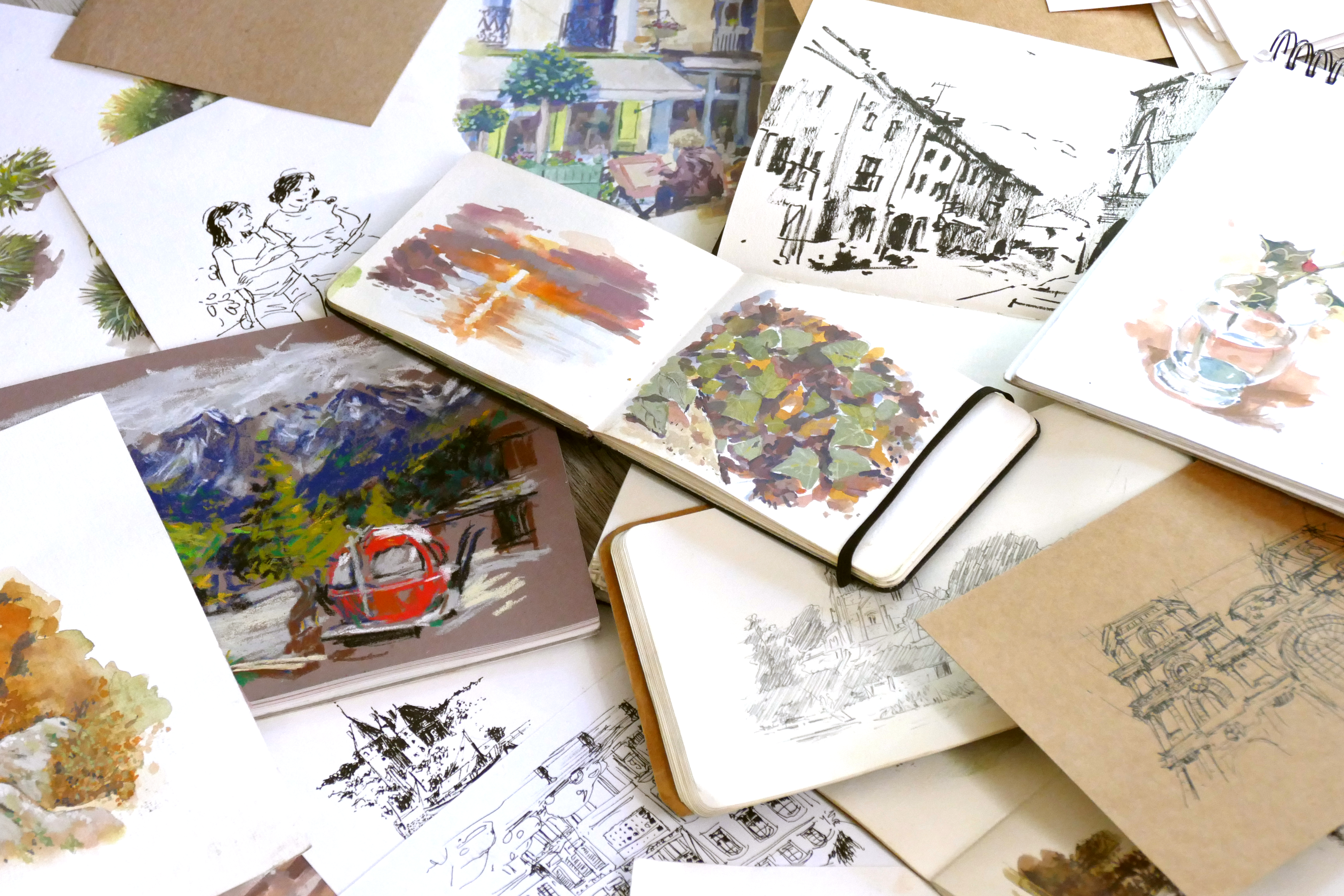 Voyager au grès des sujets qui m’inspirent, un chevalet à la main et un sac sur le dos, avec carnets, feuilles plus ou moins grandes, peintures, pinceaux, pastels, encres fusains et autres outils d’exploration. Voici le décor de mes errances.
